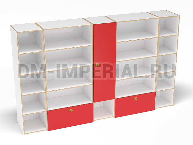 Стенка состоит из пяти секций. Акцент сделан на открытом варианте хранения. Из закрытых элементов: шкафчик в середине и два выкатных ящика в нижней части. Ширина секций отличается: более узкие чередуются с широкими. Такой дизайнерский прием позволяет несколько визуально разгрузить конструкцию. Дополнение мебели акцентными окрашиваниями может добавить индивидуальности и сделать ее центральным элементом интерьера помещения.