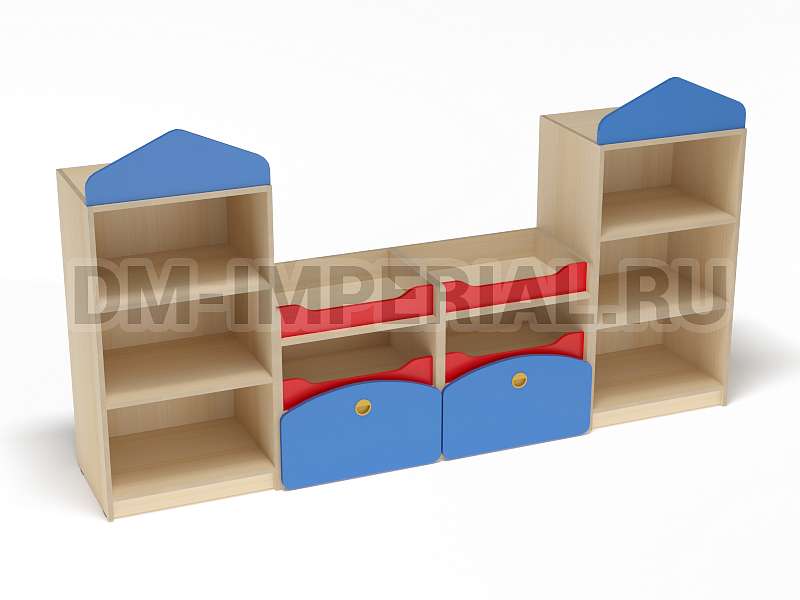 Представляем Вашему вниманию детскую игровую стенку «Любаша». Модель имеет необычный дизайн. Стенка состоит из четырех секций для хранения. Два боковых стеллажа стандартны: открытая система хранения, несколько полок. В середине располагается низкая секция с открытыми и закрытыми, выкатными ящиками. За счет высоких передних перегородок и глубины вместительность стенки увеличивается. В ящиках можно интересно расположить игрушки, предметы для творчества и спорта. Боковые стеллажи подойдут для книжек и учебников.
