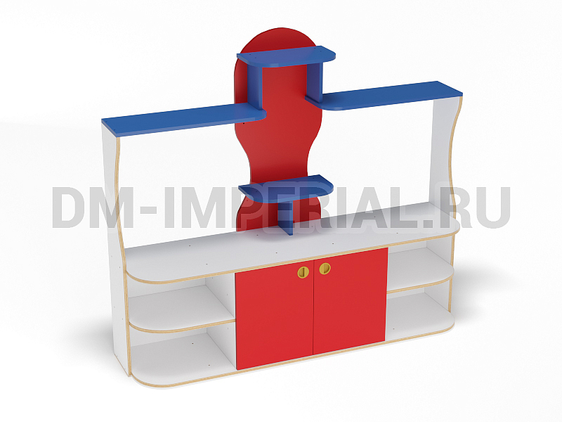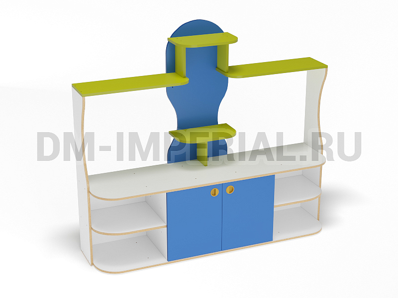 Данный детский уголок для ДОУ обладает довольно компактными размерами (1600х420х1400 мм) по сравнению с другими моделями в серии. Мебель хорошо впишется в любой интерьер благодаря универсальному дизайну, не будет занимать много места и смотреться громоздко. При этом конструкция уголка практична: предусмотрено много мест для хранения. Нижняя часть – вместительная тумба с открытыми полками и закрытым шкафчиком. Просторная столешница подойдет для расположения органайзеров с инструментами для творчества, выставок рисунков и поделок, а также небольших клеток и террариумов с питомцами для живого уголка. В верхней части предусмотрена система полок, которую можно оформить декором.